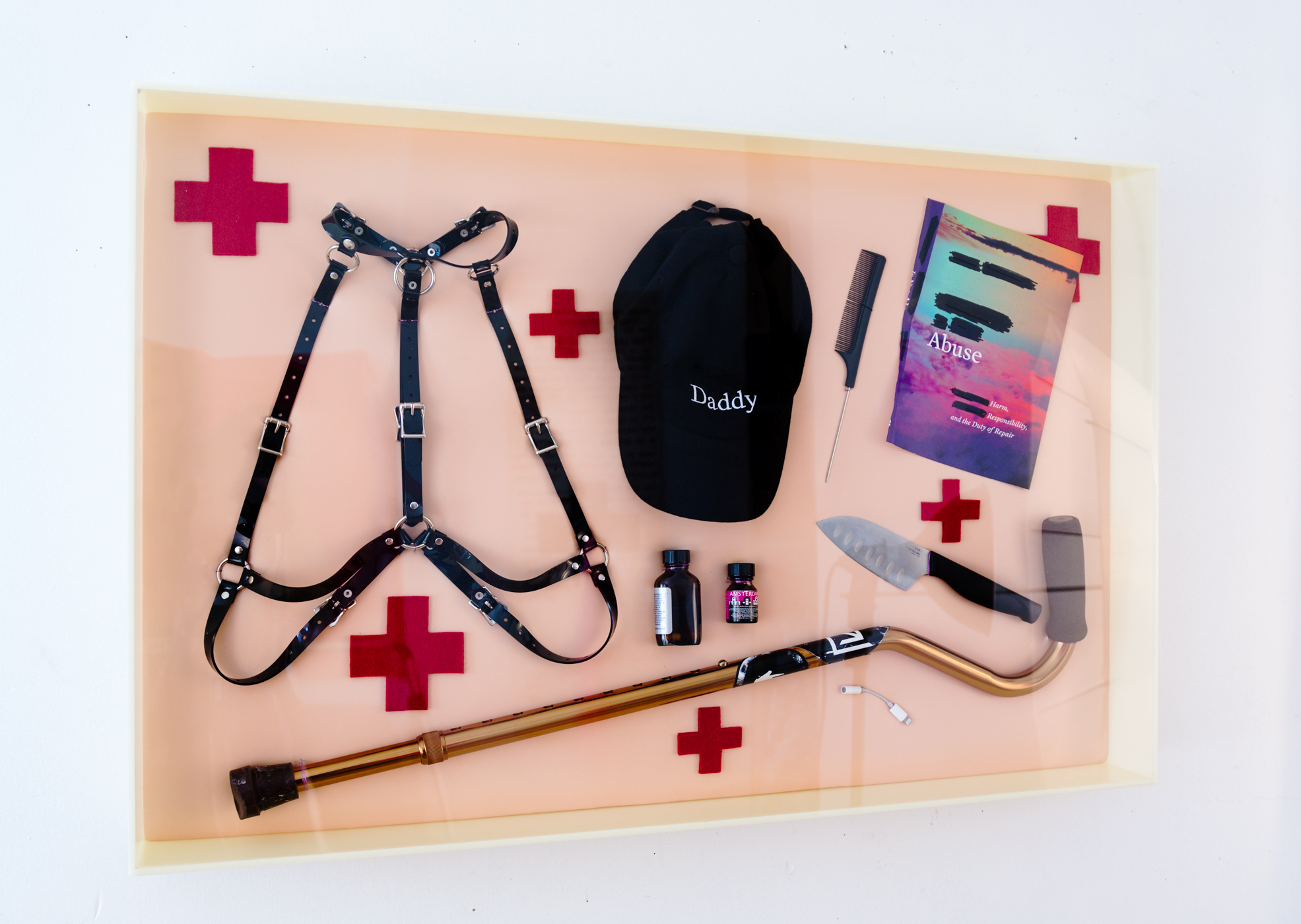 Using disturbing details from my personal life, I pair objects with text, blurring the boundary between art and life. After suffering trauma from a relationship, I drafted with my therapist a letter of what had happened to me, and then I chose a paragraph, which I machine embroidered letter by letter on a white piece of fabric; speaking about emotional abuse tactics of power and control. I paired the letter with a box full of unwanted objects gifted or left behind by the ex. In question, who had previously texted me: “The Way I React to You is Unsettling”, as a way of crafting an apology, after an incident. Bringing in to the conversation what a lot of women had experienced. I touch on subjects such as: misogyny, when perpetrators pose as victims, oppression, chronic illness and invisibilization of abuse in queer relationships. My work always has elements of poker-faced humor such as the last part of the letter. Making allusion to pop culture phenomenona where entitlement and policing are in the front center, closing the letter with the hashtag #harrassmentharrypatty. Introducing in to the conversation tensions of privilege and inequality, where the power of entitlement is increasingly leading to policing and false accusations to exclude Latino immigrants from shared spaces, by developing hostile environments, as we see it increasingly happening, not only in public, but also in private.